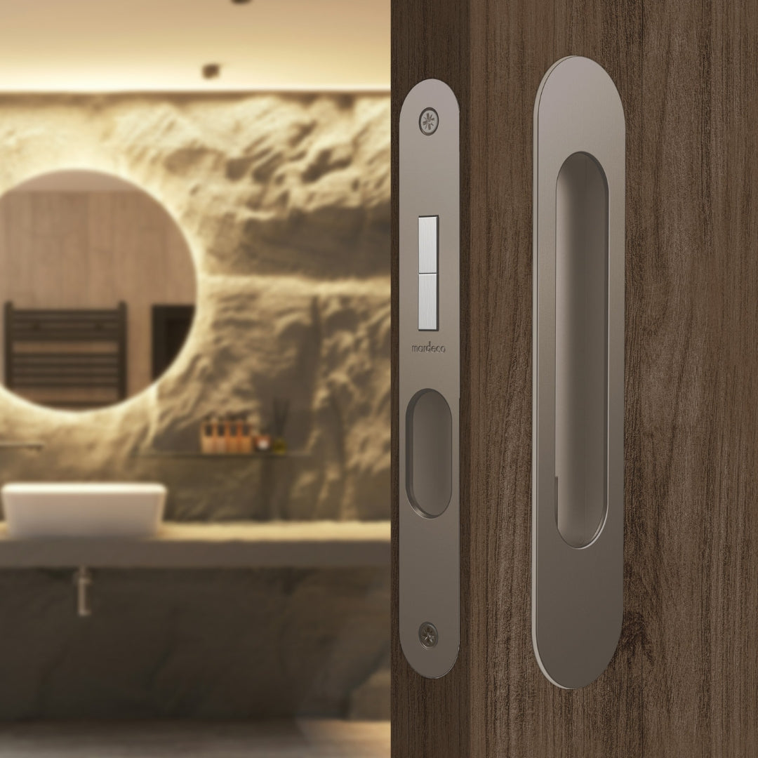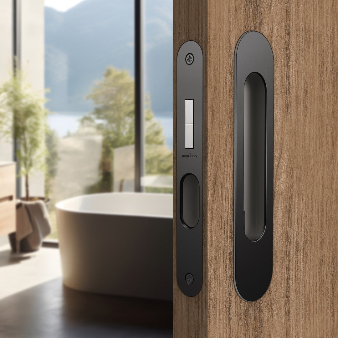 Make a bold design statement with the Matt Black Mardeco Radius Edge M Series Flush Pull Privacy Set, perfectly paired with a rich brown wooden sliding door. Sleek, minimalist, and effortlessly modern, this flush pull set combines architectural elegance with everyday functionality.